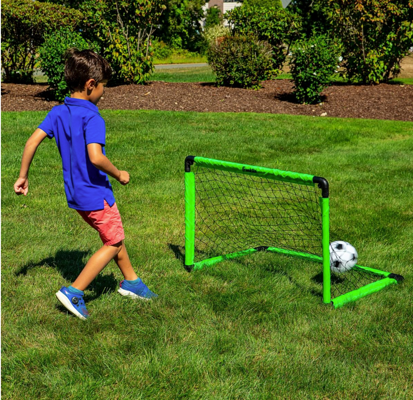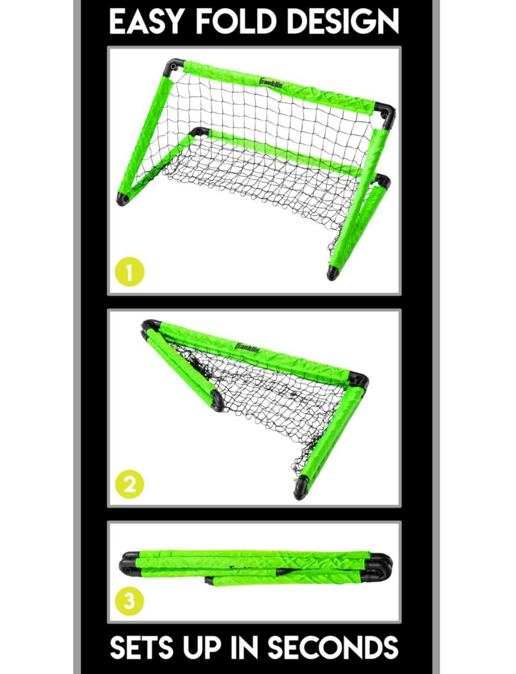 The Franklin Sports Mini Soccer Goal Set is the perfect all-in-one set for any young soccer player! This set comes with the mini folding soccer goal, mini soccer ball, and inflation pump so you'll have everything you need to get the game started. Plus the lightweight PVC construction makes this set easy to take on the go so you can play inside, outside, or anywhere else! The goal folds flat for easy and convenient storage when not in use. Get your young soccer fan in the game today!