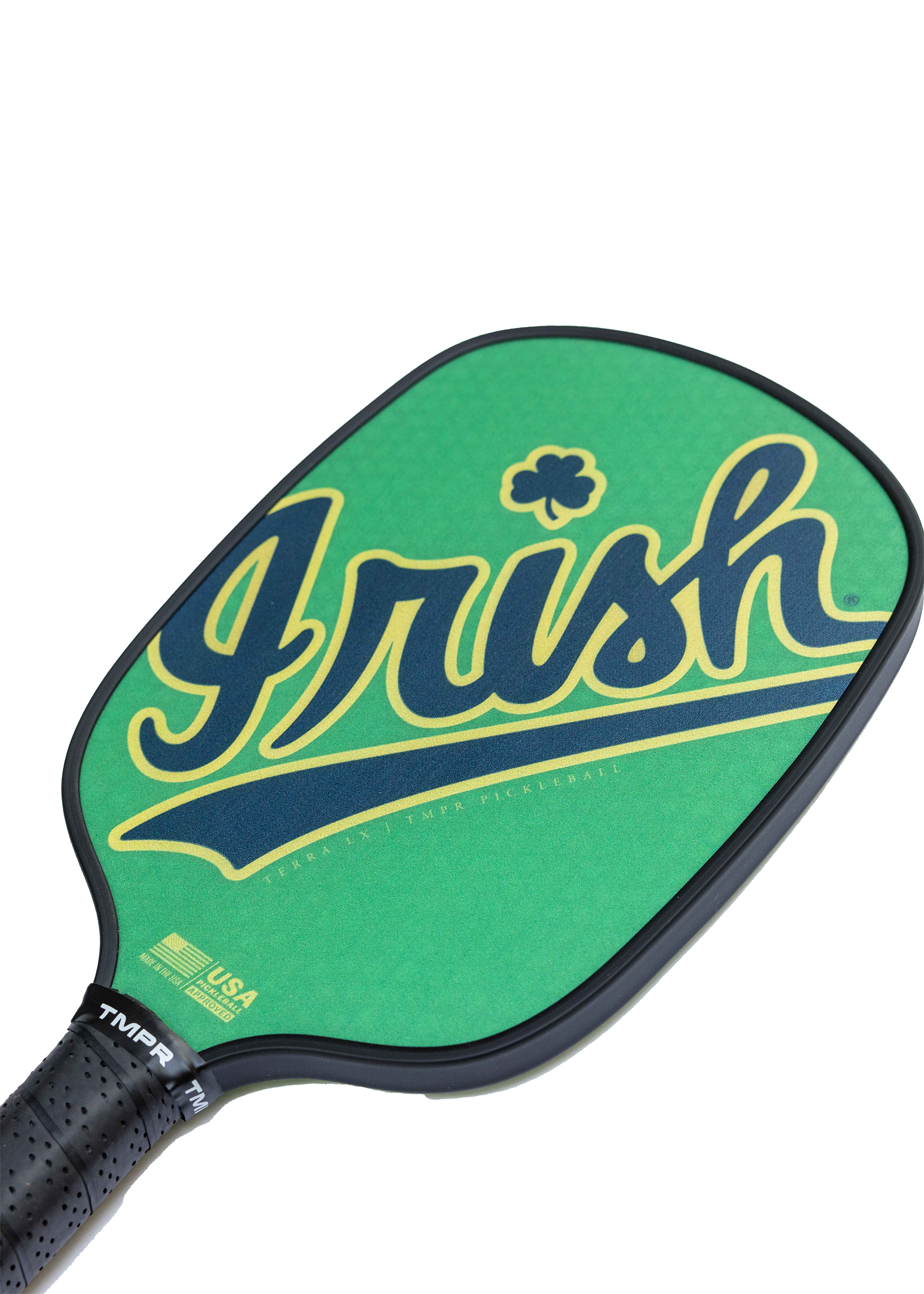The Luck of the Irish Notre Dame pickleball paddle offers an exceptional blend of control, power, and precision. It features the advanced 16 mm Luxe Core™, combined with a fiberglass face and our proprietary SPINGRIP™ surface, all layered over a honeycomb polypropylene core. This design provides a superior touch and feel, enhancing your gameplay. The paddle's 5.25” handle length is ideal for two-handed backhands and incorporates TMPR's innovative vibration-dampening technology, ensuring a comfortable grip and reducing hand fatigue.